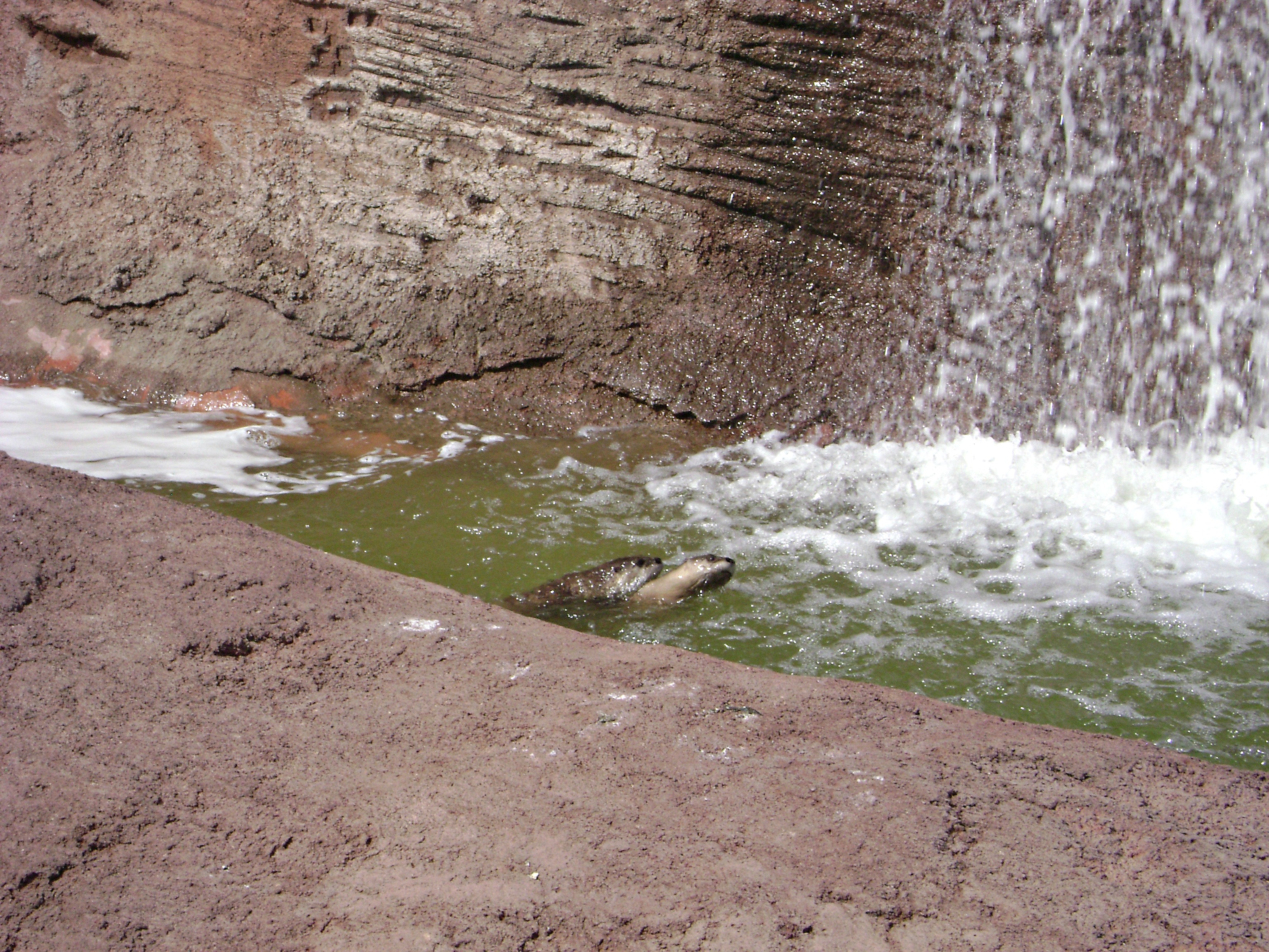 Beneath that waterfall, resides two playful otters who spend their afternoons swimming together.