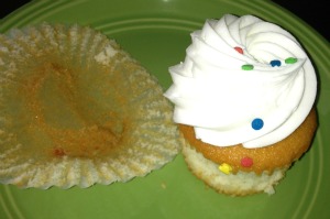 With the cake now split into halves, it’s time to bring together the two most crucial elements of the cupcake – the cake and the frosting.