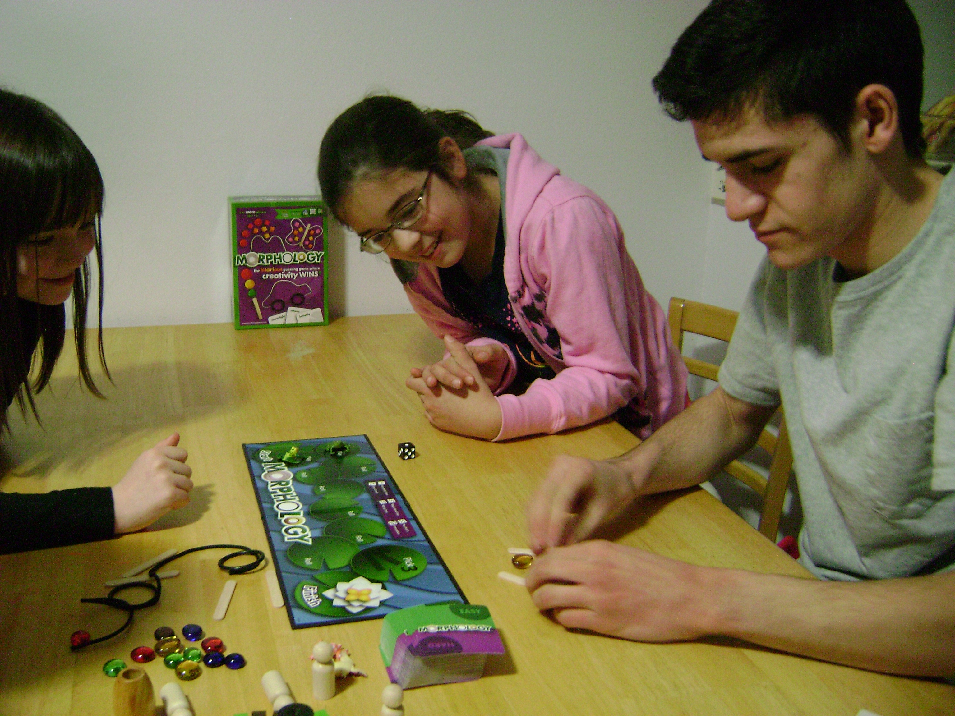 We divided into teams and picked the Morphologist. Then the fun began as we drew cards from the deck and tried to guess the word being created from the pieces. We moved along the Lily Pads on the board. We groaned when the Morphologist was challenged to create with his eyes closed, with only one hand, with 5 pre-picked items and so much more.